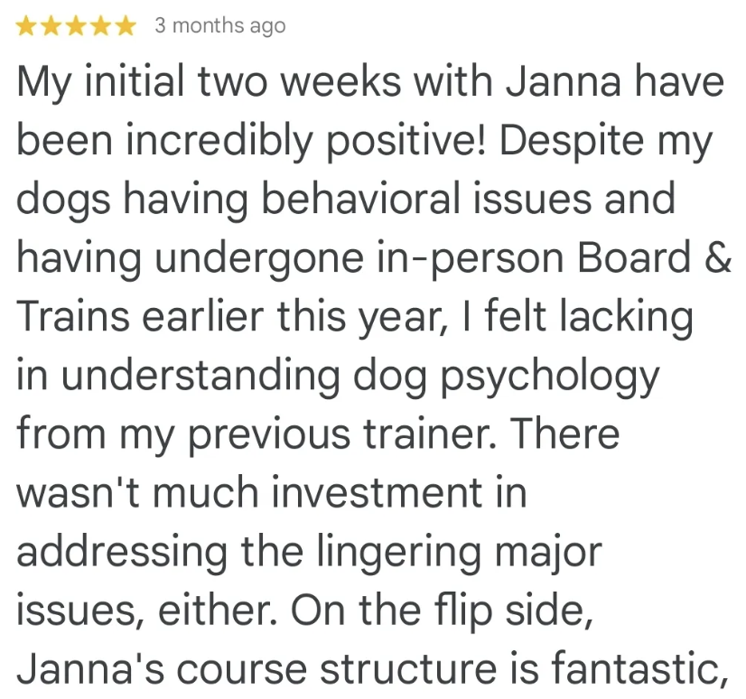 If you don’t achieve meaningful progress toward your dog’s personalized training goals within 30 days, I will continue working with you for free until you do—provided you’re following the plan, instructions, and taking action.